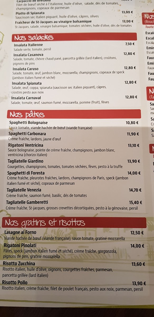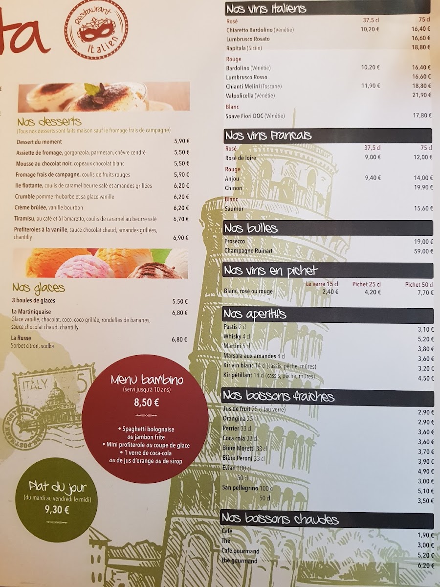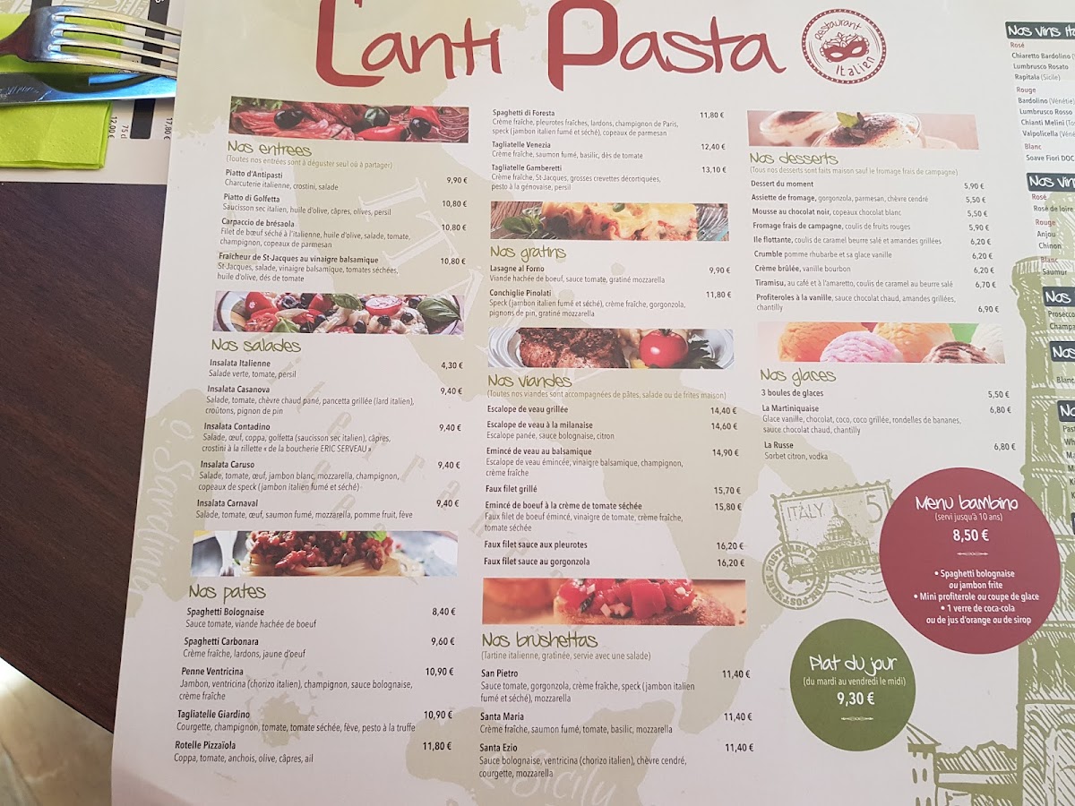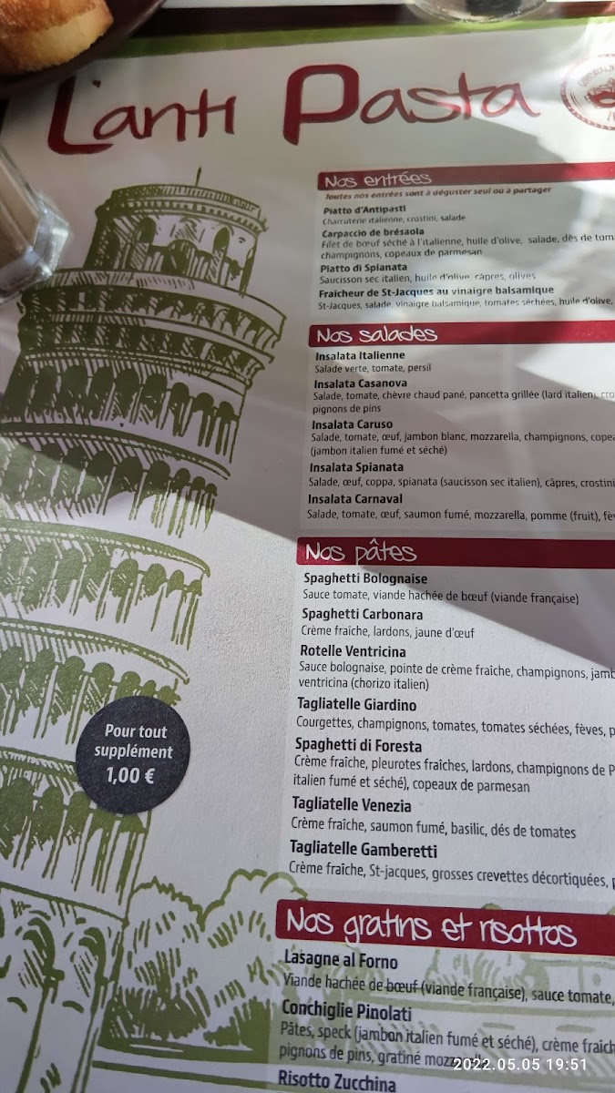 The menu at L'anti Pasta in La Flèche offers a delightful range of Italian-inspired dishes, each crafted to offer an authentic dining experience. The restaurant’s signature pasta options stand out, with dishes like Risotto, a creamy and flavorful classic, and Spaghetti Carbonara, a rich and satisfying plate featuring a perfect balance of pancetta, eggs, and parmesan. Another great choice is the Pâtes À la Carbonara, which brings a similar creamy experience, ideal for those who love traditional Italian flavors.